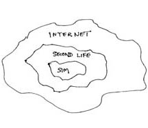 People have speculated that Linden Labs will release the server source code as open source, (open source for the client was recently released), and LL has talked about moving more of Second Life to the Web, to reduce the burden on Second Life servers. Currently, “users can create accounts, check whether their Second Life friends are online, and buy and sell land and Linden Dollars using a Web browser (Information Week).” But, for Second Life to be a global interface much like the Web is today, it would have to go public domain, and to move out of the the current cozy nest (see diagram 1 below) to become a virtual reality interface that will replace the World Wide Web ( diagram 2 below).