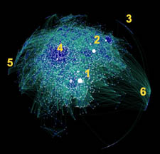 [The] blue blob represents a balanced sociopolitical discourse. The prevalence of blue in this area shows that most of these links are reciprocal, suggesting a sort of metadialogue between bloggers who hurl headlines at one another. The brightest light belongs to syndicated columnist Michelle Malkin.
