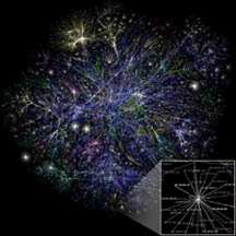 Neomeme, recently, brought both the beautiful map of the internet and the blogosphere that are at the beginning of this post to my attention. The image on the left traces links on the blogosphere – blue are reciprocal links and green are one way. Discover posted the original story which will tell you where your favorite, “jocks, gadget hounds, political junkies, and porn aficionados hangout,” and which blogs create the white hot spots. But, what struck me was how color coding the two way links blue on the map told a new and very interesting story of the blogosphere from the point of view of “active”citizenship.