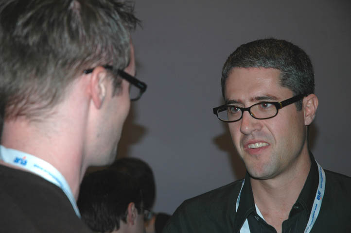 Blake Lewin, VP Product Development, Turner Broadcasting Inc., stopped by to chat with members of the HiPiHi team after the Visionary Panel. Raph Koster on the right shakes hands with someone off screen.